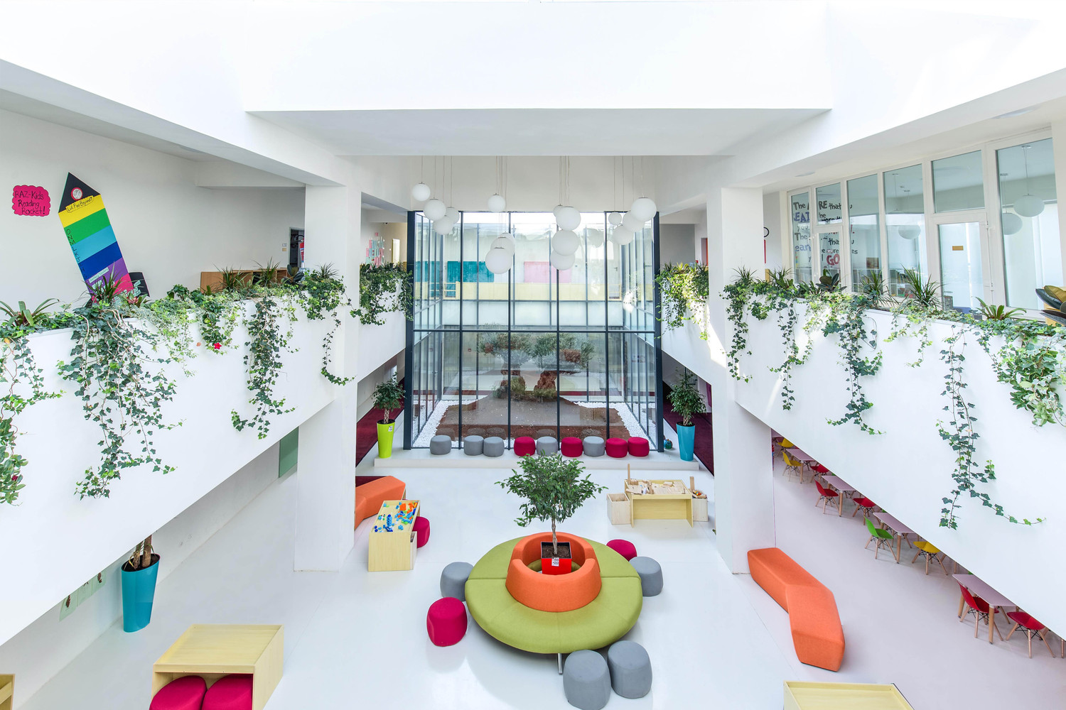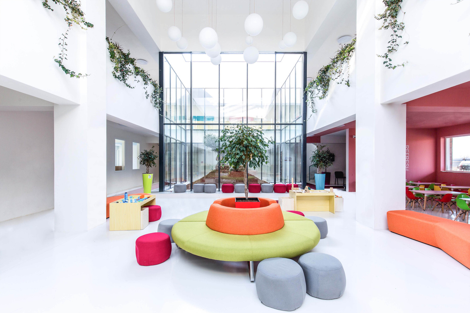 فضای مهدکودک دارای نگارخانهای مرکزی است که از طریق یک آتریوم نورگیر، بخشهای مختلف را به هم متصل میکند. در میانه این آتریوم، یک درخت زیتون چندساله قرار دارد که نماد رشد، تداوم و انتقال تجربه از نسلی به نسل دیگر است. این طراحی خلاقانه حس امنیت و تعلق خاطر را برای کودکان ایجاد میکند و یادگیری را به تجربهای لذتبخش بدل میسازد.