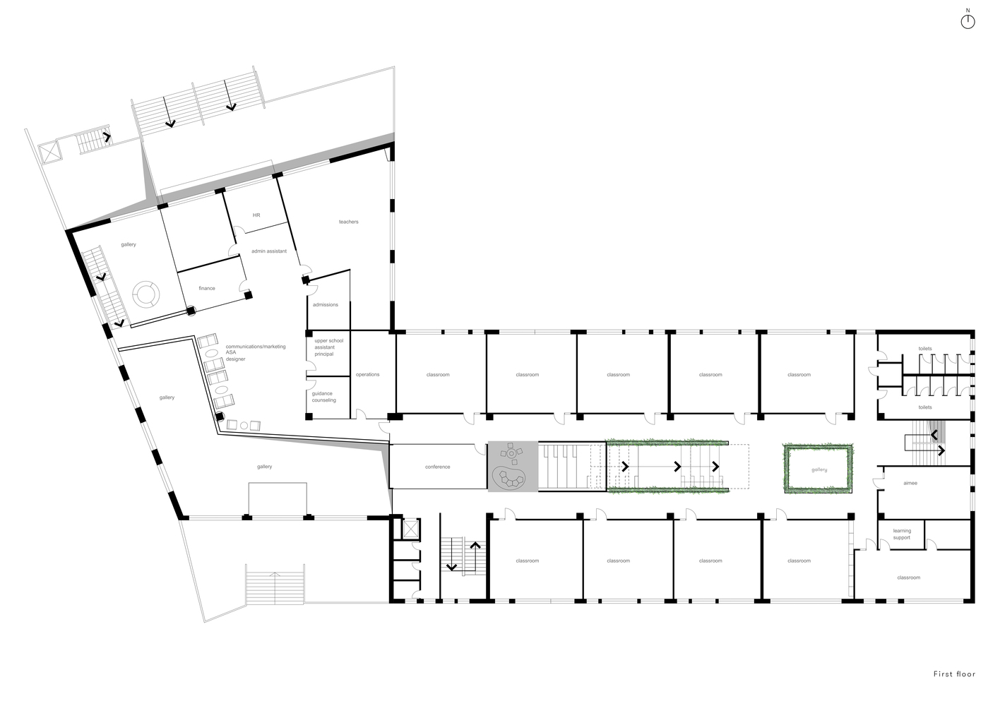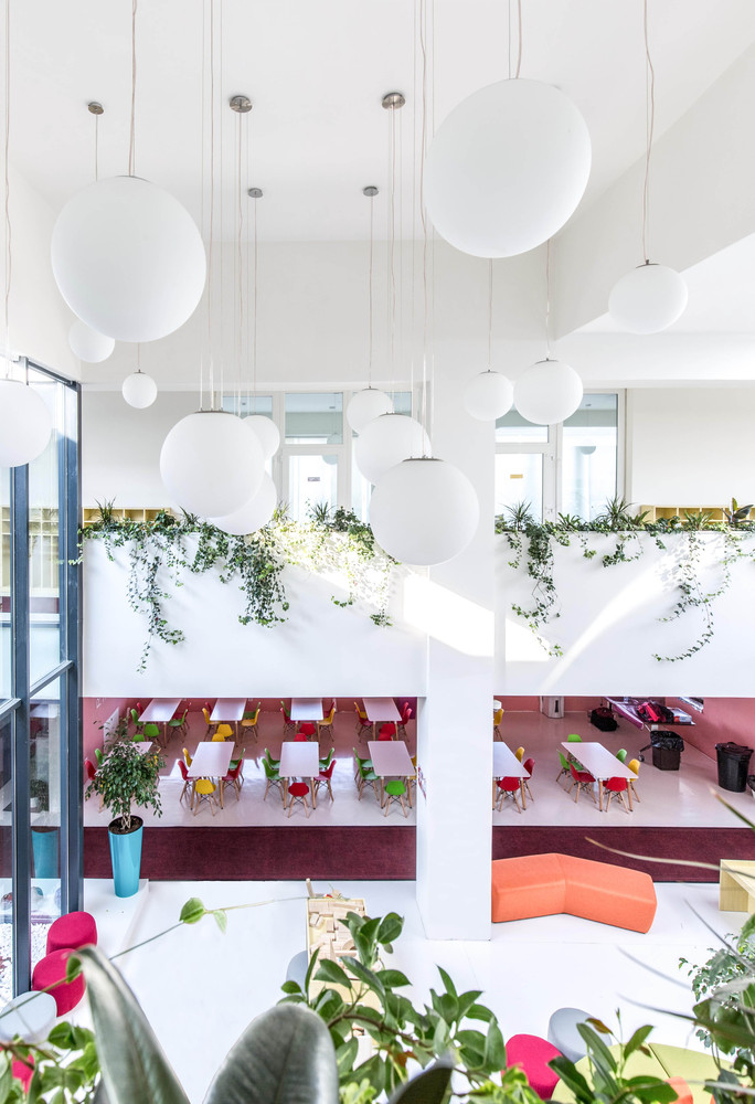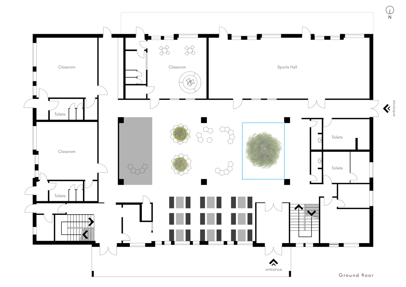 حیاط مدرسه با «اُئازهای دایرهایشکل» طراحی شده؛ بخشهایی که یا پوشیده از گیاهان سبز هستند یا محلی برای بازیهای کودکانه. این اُئازها بهطور هوشمندانه به هم متصلاند و فضایی پویا و زنده میسازند. همچنین وجود یک آمفیتئاتر چندمنظوره، زمین ورزشی روباز و سالن سرپوشیده، امکان برگزاری رویدادها و فعالیتهای مختلف ورزشی و فرهنگی را فراهم کرده است.