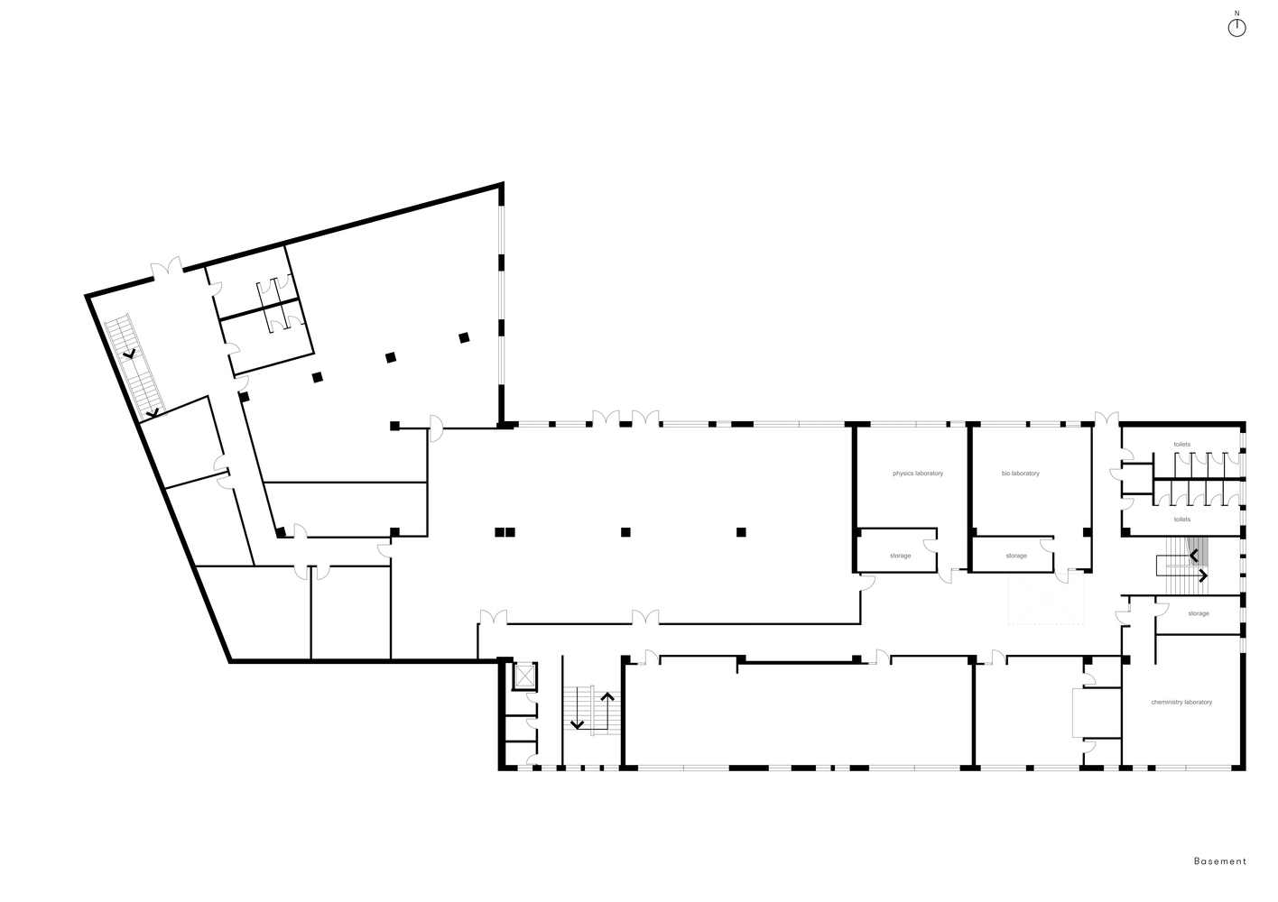 - طبقه زیرزمین شامل آزمایشگاهها، فضاهای فنی، آشپزخانه و بوفه است.