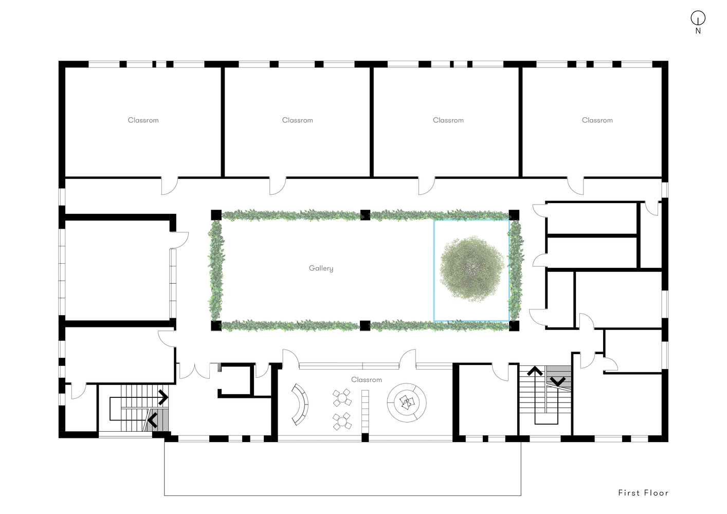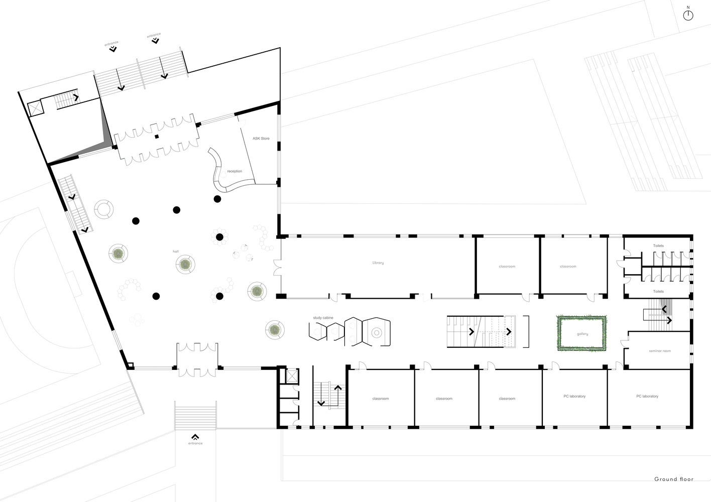 - طبقه همکف بهعنوان ورودی اصلی، فضایی انعطافپذیر برای برگزاری رویدادها دارد و با آمفیتئاتری سهگالری به سه طبقه فوقانی متصل میشود. نور طبیعی که از سقف وارد میشود، تمام فضا را روشن و یکپارچه کرده است.