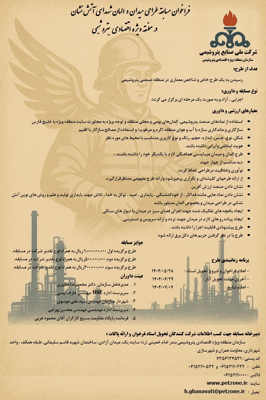 به پاسداشت مقام والای شهدای آتشنشان، سازمان منطقه ویژه اقتصادی پتروشیمی فراخوانی برای طراحی محوطه و اجرای عناصر شهری در میدان شهدای آتشنشان واقع در بلوار شهید هاشمی منتشر کرده است.