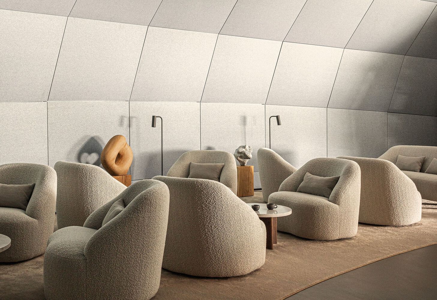 فضای داخلی با تقسیمبندی هوشمندانه به بخشهای کوچکتر، حس صمیمیت و خلوتی خوشایند ایجاد کرده است. چراغهای قابلجابهجایی، فرشهای نرم و ایستگاههای خدماتی سفارشی، هماهنگ با خطوط منحنی و بدون استفاده از فرمهای مستطیلی رایج، جریان طبیعی حرکت را ممکن میسازند.