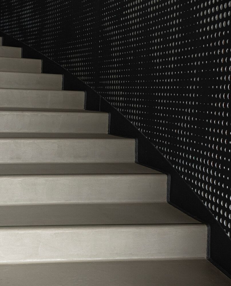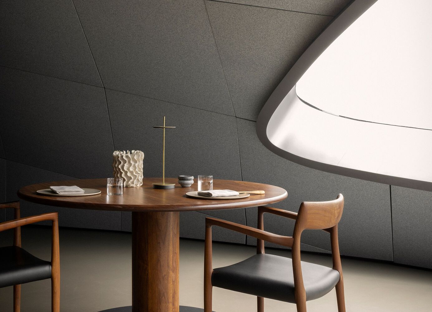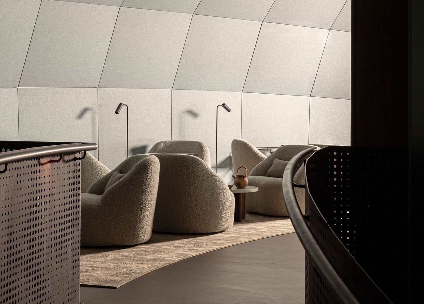 فضای داخلی این سازه توسط گروه معماری نورم طراحی شده است؛ جایی که گرمای چوب گردو، مبلمان دستساز و نورپردازی ملایم با خطوط منحنی فولادی در هم آمیخته و محیطی گرم و صمیمی در دل یک ساختار مدرن و قدرتمند خلق کرده است.