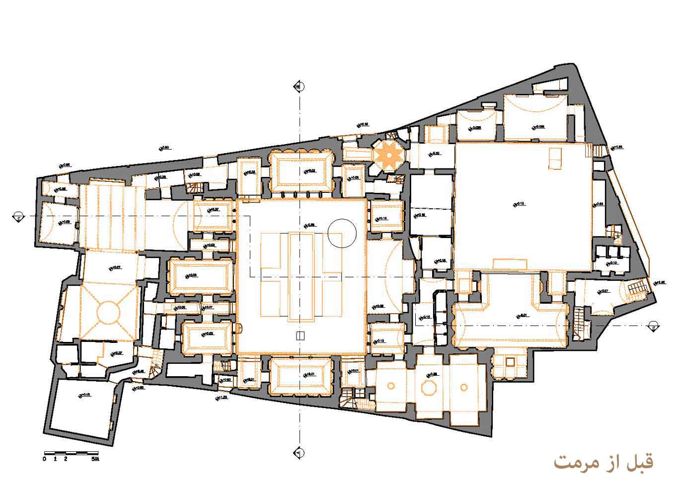 • بازنمایی ساختار تاریخی در قسمت‌های دارای ارزش‌های قاجاری با احیای تزئینات اصیل بر اساس اصول بین‌المللی مرمت.