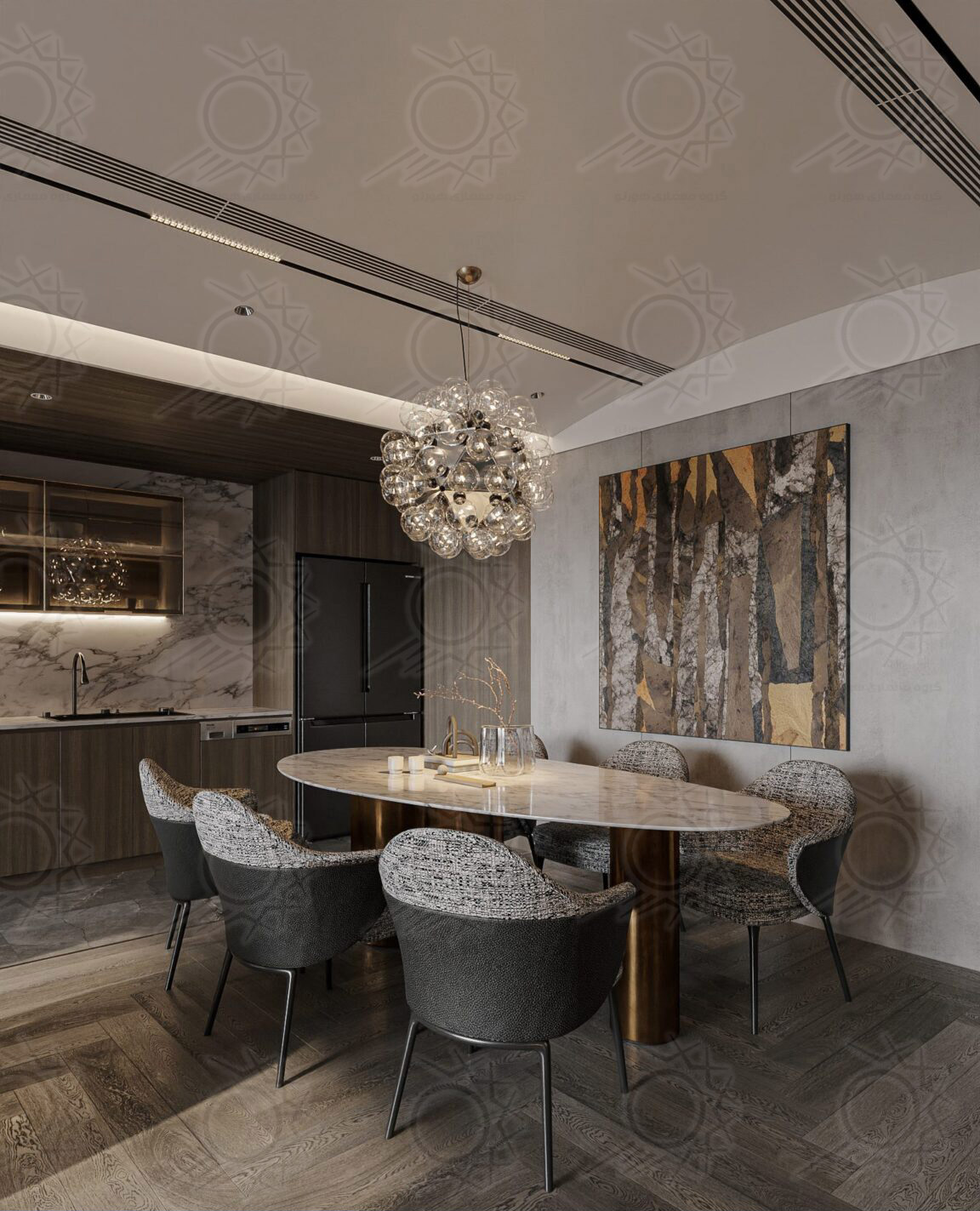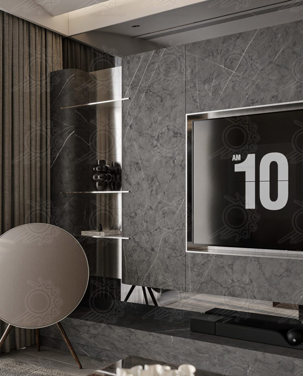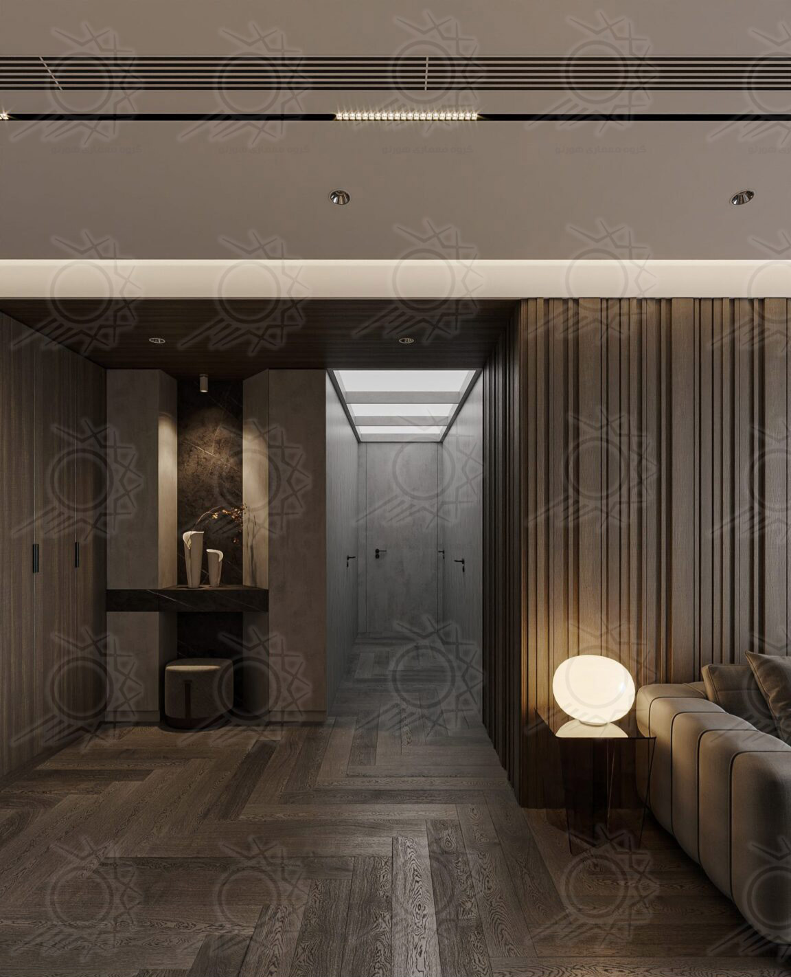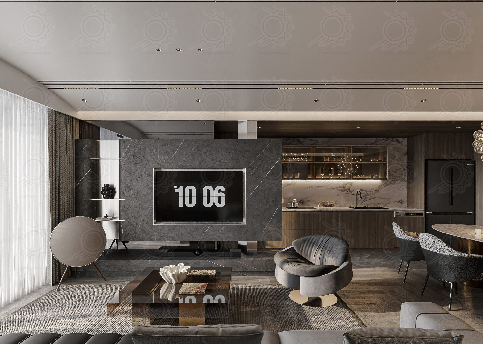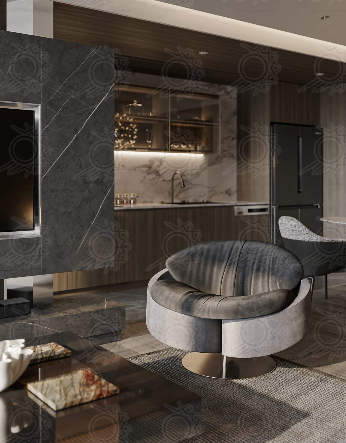 در نشیمن، استفاده از چوب تیره متمایل به طوسی در کنار سنگ سفید و کناف روشن، ترکیبی متعادل از تضاد و هماهنگی ایجاد کرد. این انتخاب متریال، حس عمق و شکوه را به فضا افزود و با نورپردازی دقیق، ابعاد جمعوجور نشیمن بازتر و دلبازتر جلوه داده شد. در بخش آشپزخانه، طراحی یکپارچه و خطوط مینیمال، هم زیبایی مدرن و هم کارایی روزمره را تأمین کرد.