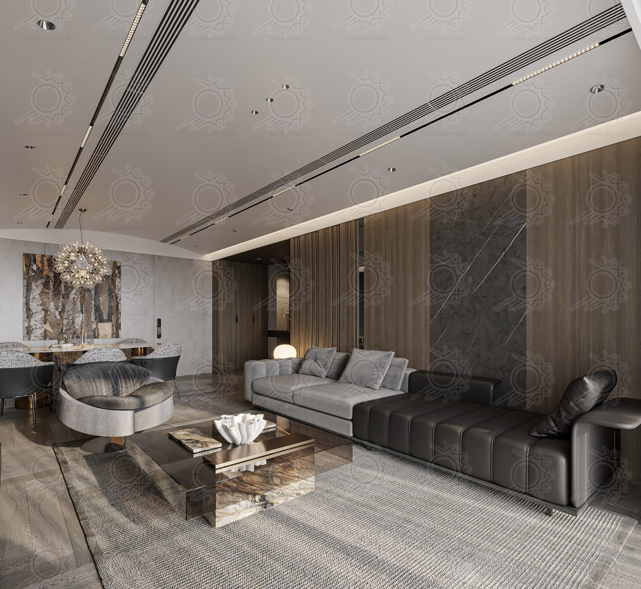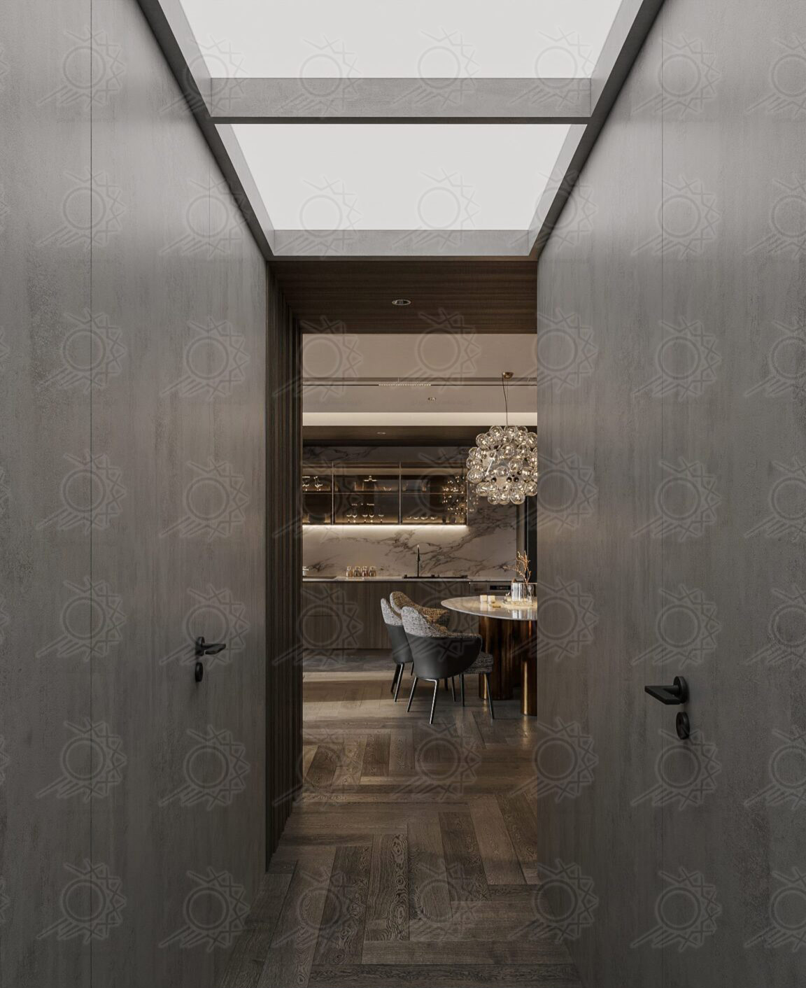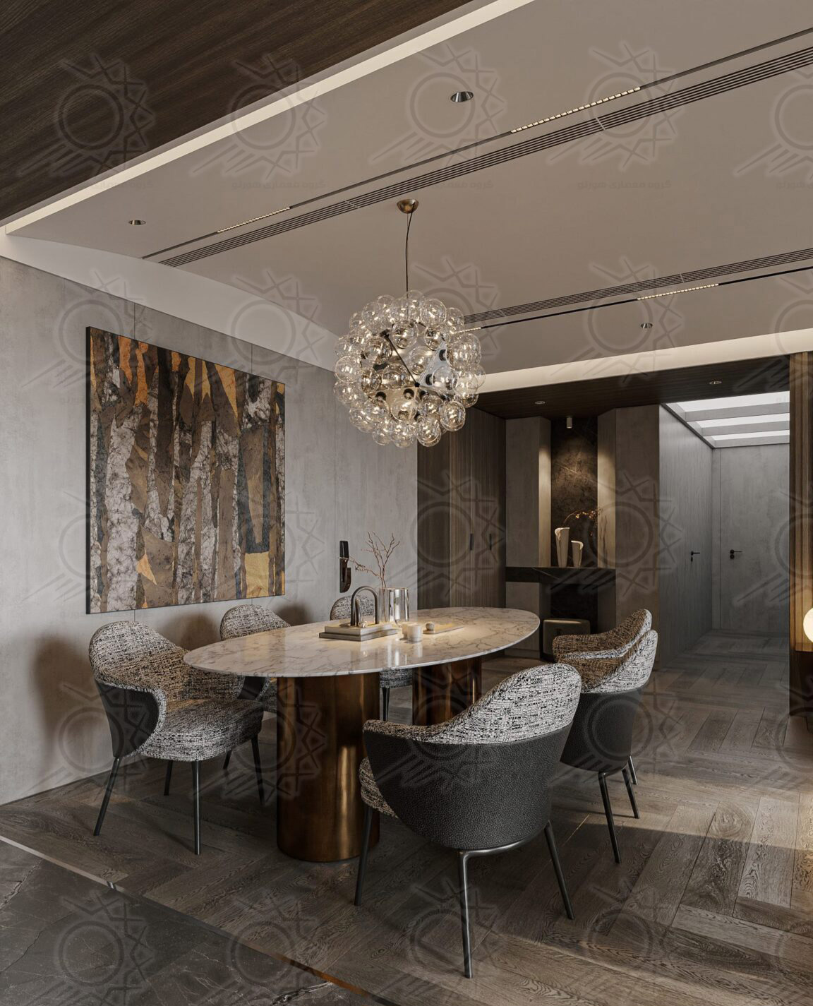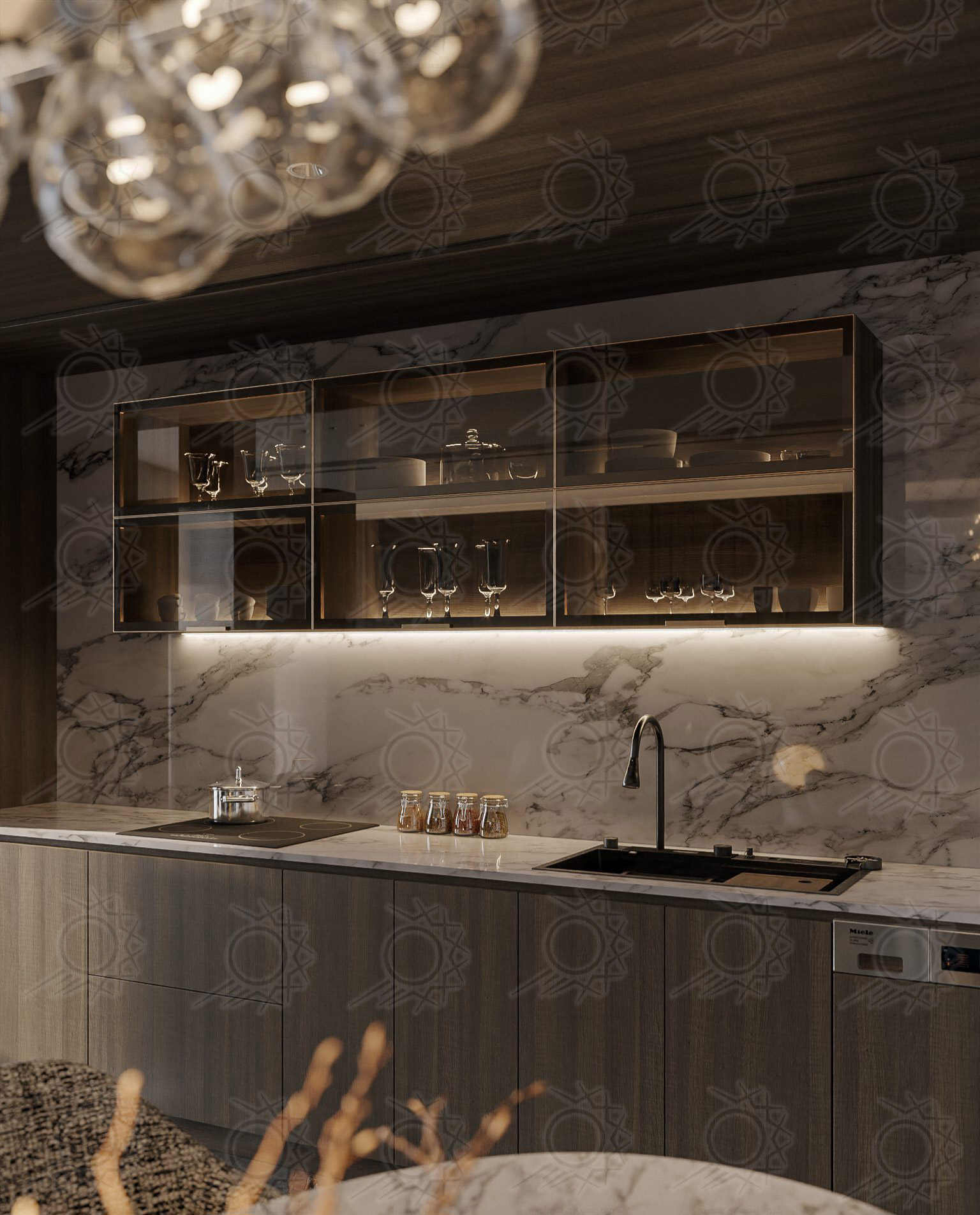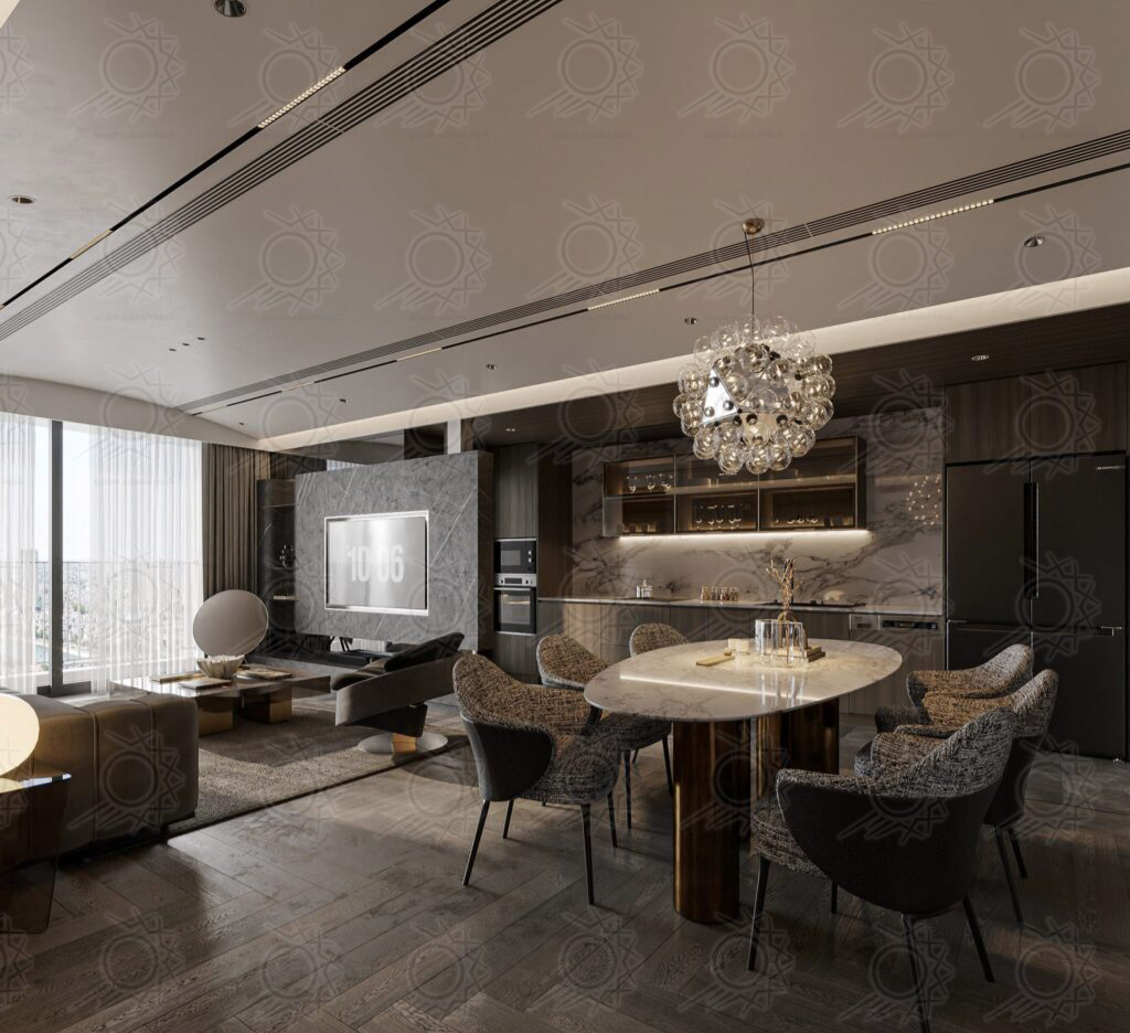 در نشیمن، استفاده از چوب تیره متمایل به طوسی در کنار سنگ سفید و کناف روشن، ترکیبی متعادل از تضاد و هماهنگی ایجاد کرد. این انتخاب متریال، حس عمق و شکوه را به فضا افزود و با نورپردازی دقیق، ابعاد جمعوجور نشیمن بازتر و دلبازتر جلوه داده شد. در بخش آشپزخانه، طراحی یکپارچه و خطوط مینیمال، هم زیبایی مدرن و هم کارایی روزمره را تأمین کرد.