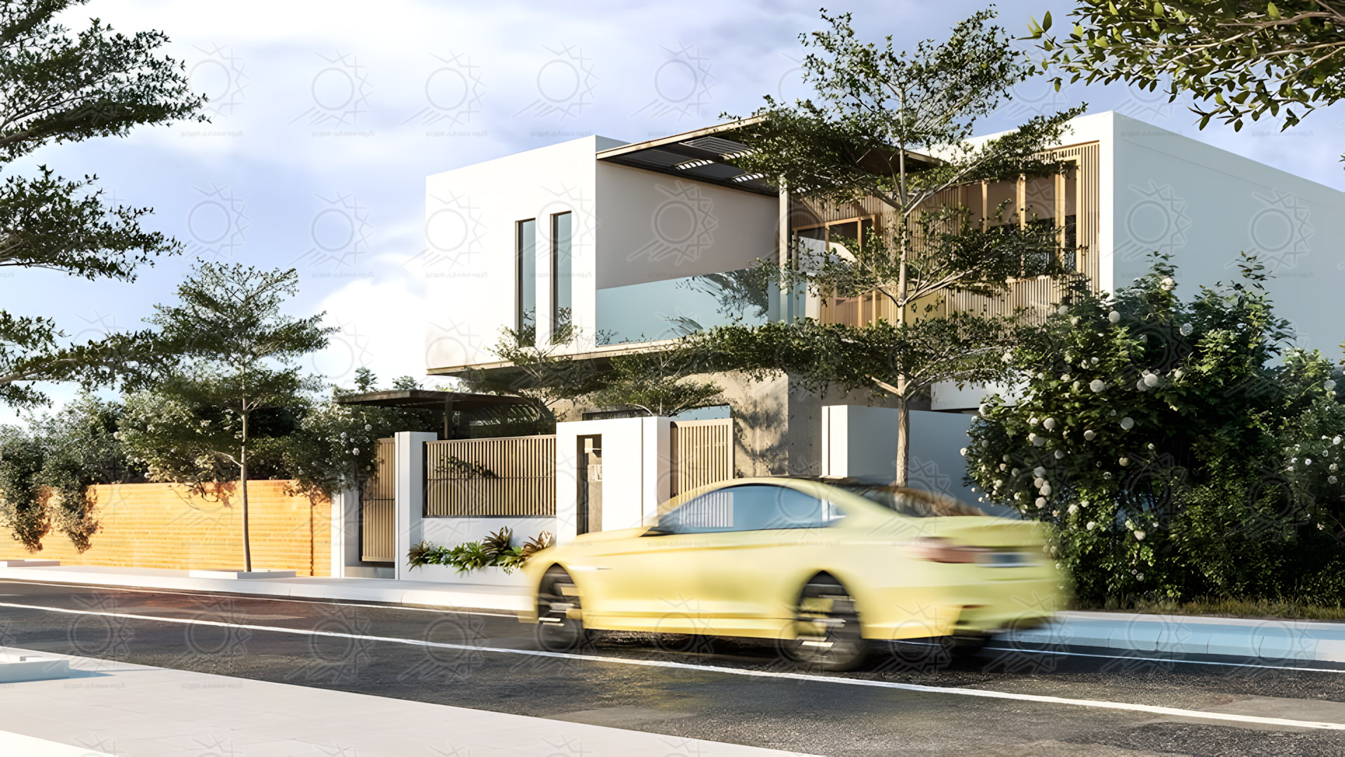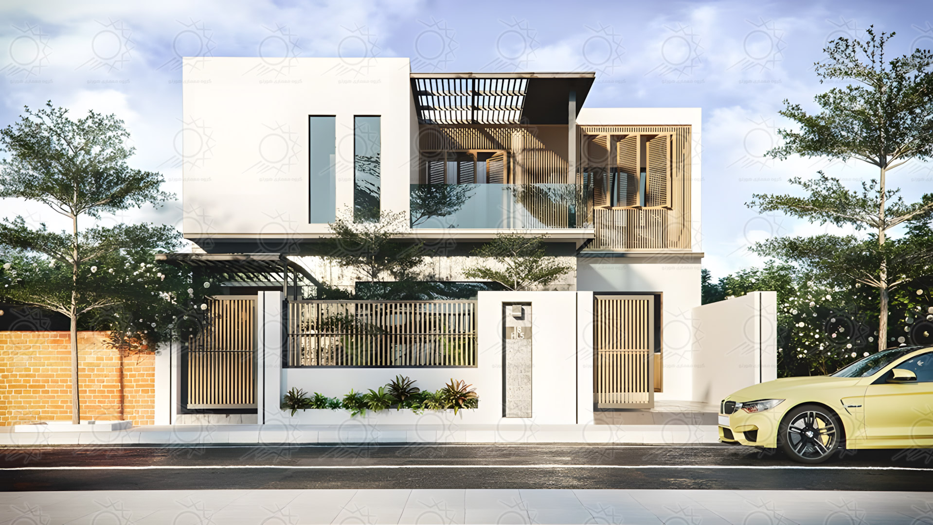 - متریالها: چوب طبیعی برای ایجاد حس گرمی، سیمان سفید نانو برای دوام و روشنایی نما.