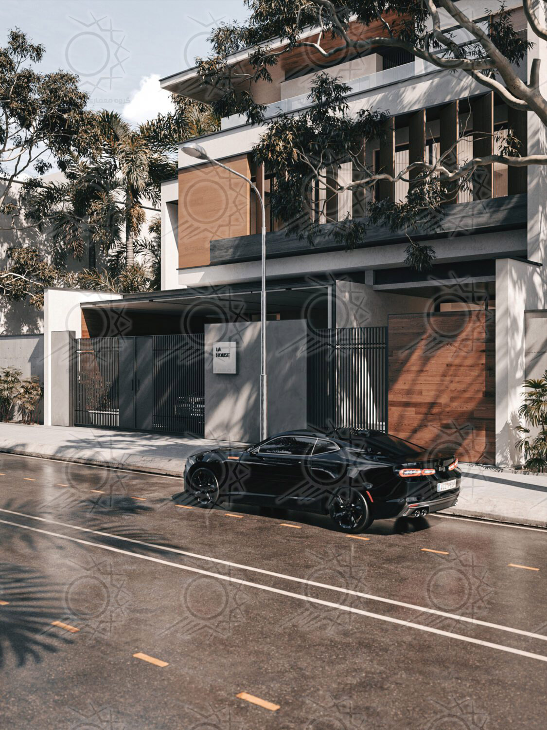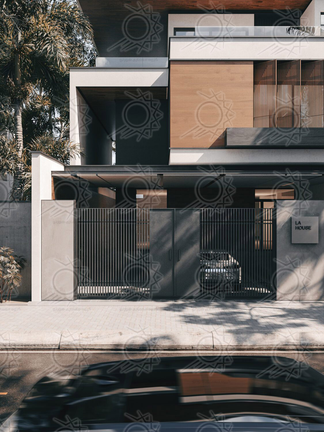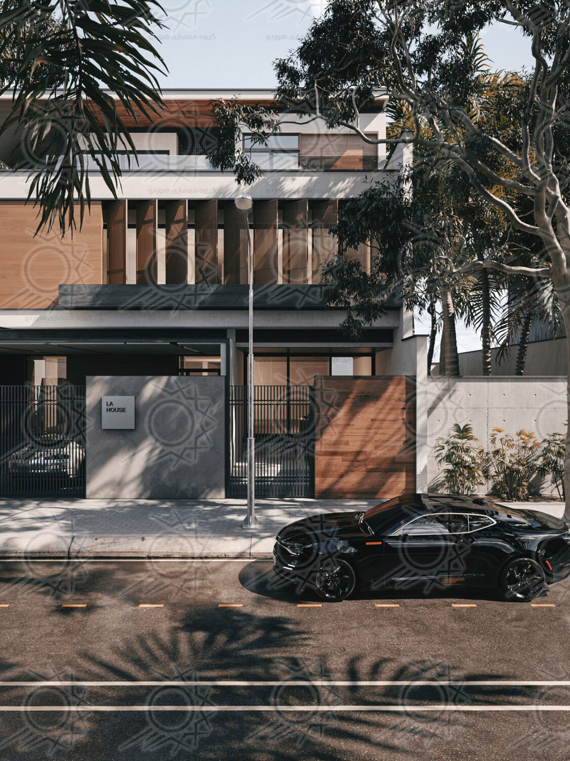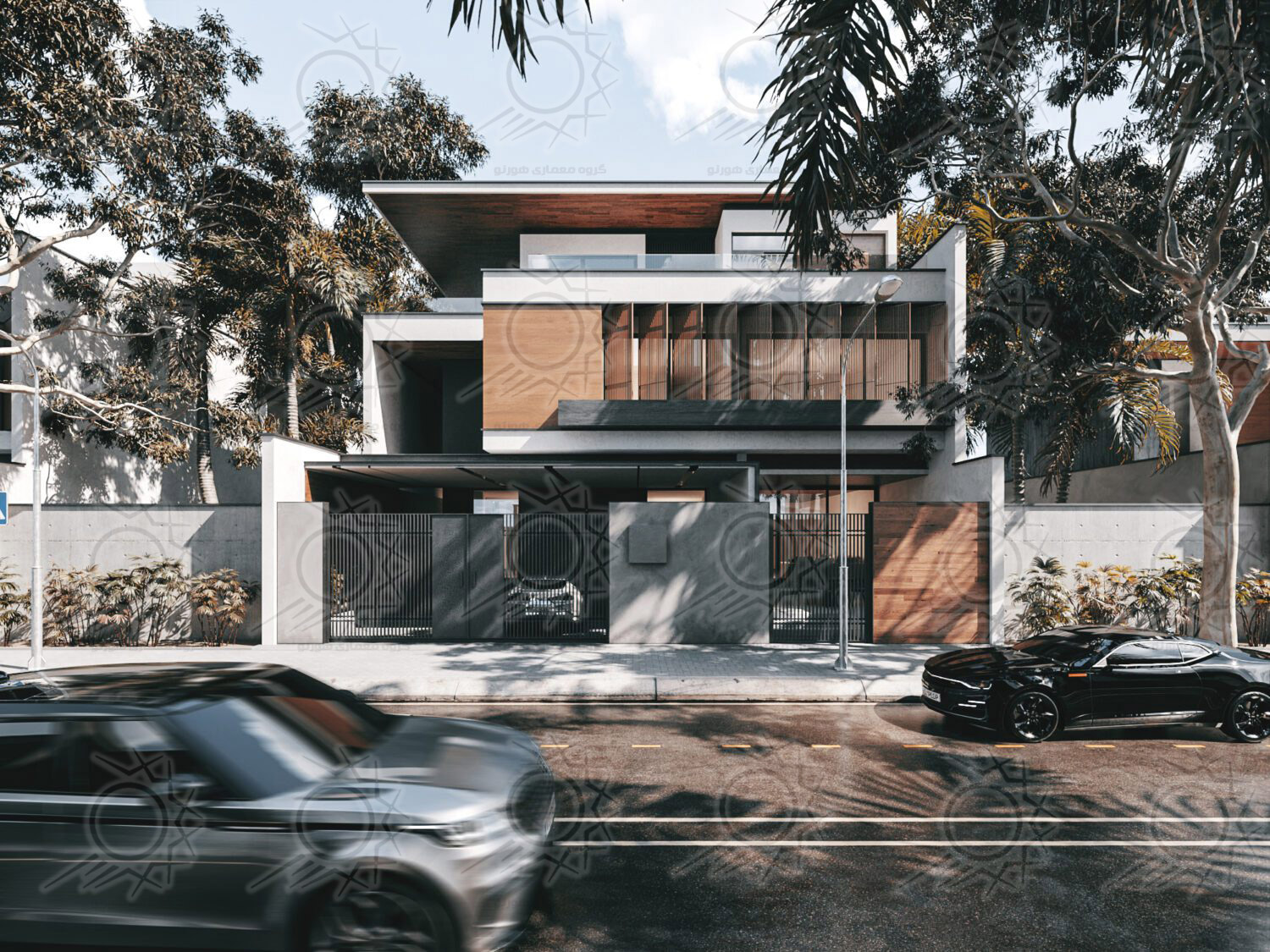 - متریالها: چوب طبیعی برای گرمی و حس طبیعی، سیمان سفید نانو برای دوام و رنگبندی روشن، و ورق گالوانیزه مشکی برای ایجاد کنتراست و جزئیات نما.